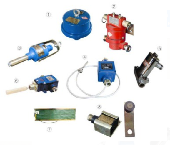 Mine belt conveyor protection device (1) Smoke Sensor (2) Mine Safety type emergency stop switch (3) Coal level sensor (4) Mine temperature Sensor (5) Mine flameproof solenoid valve (6) Deviation Sensor (7) Tear sensor or infrared tear sensor (8) Speed Sensor |